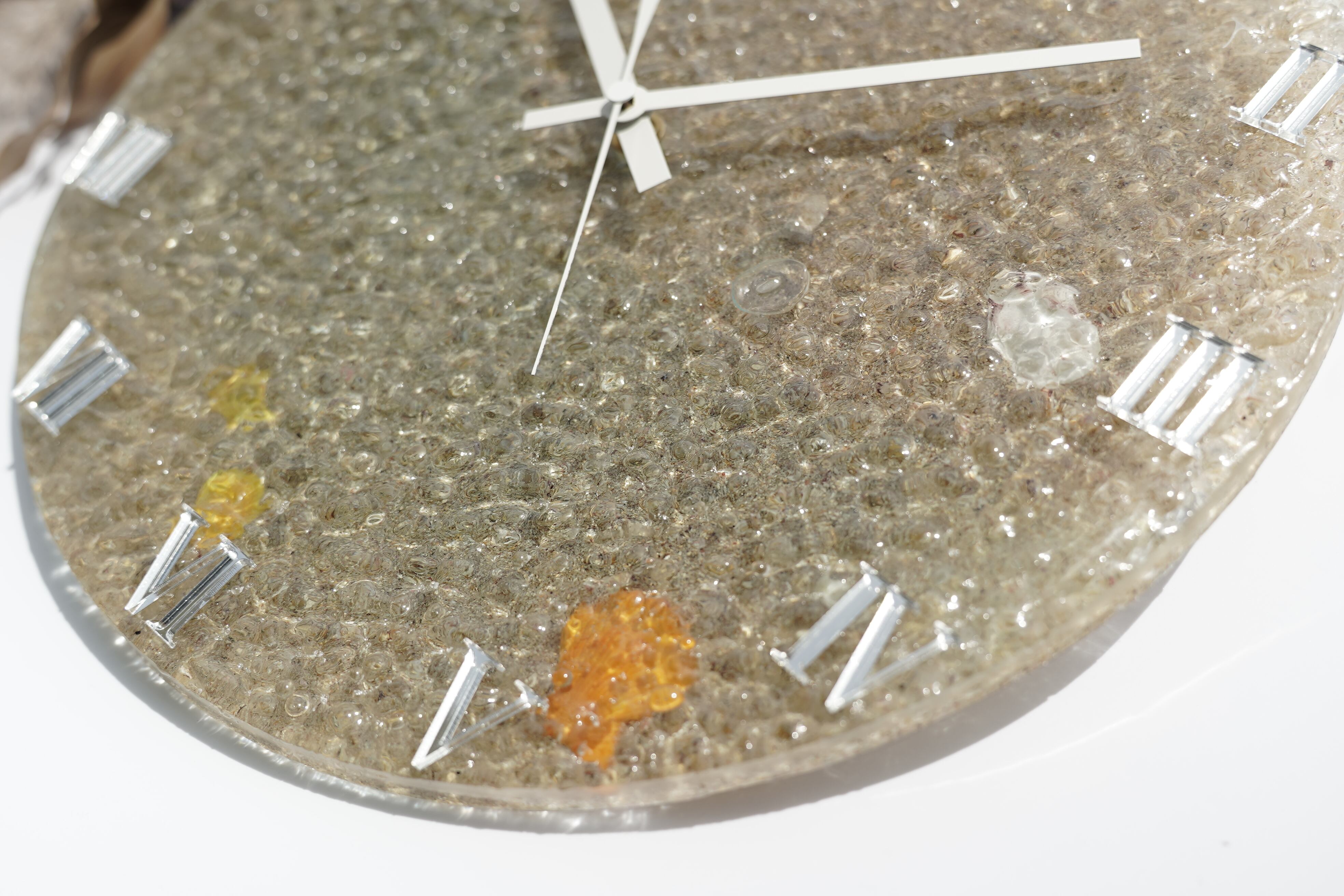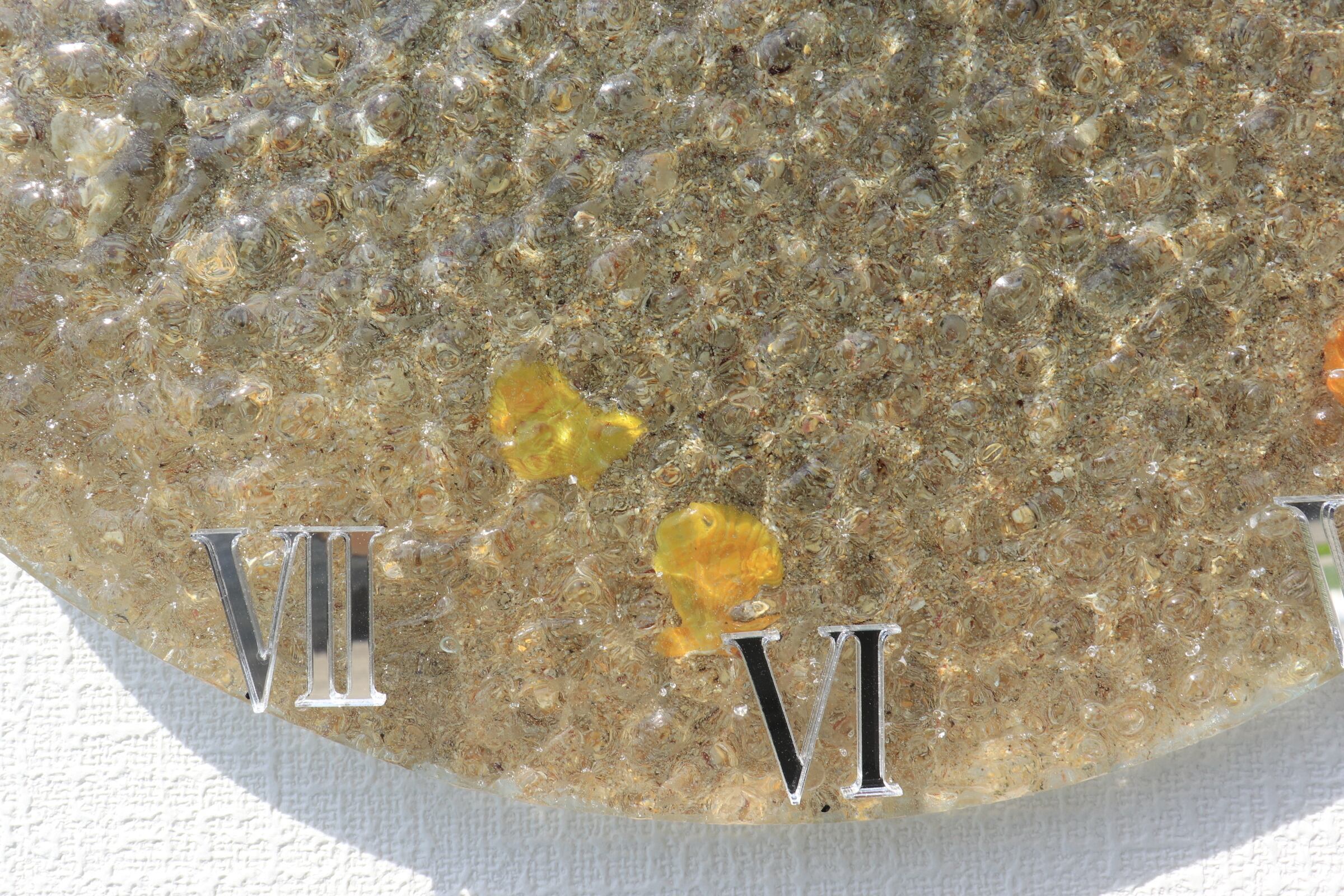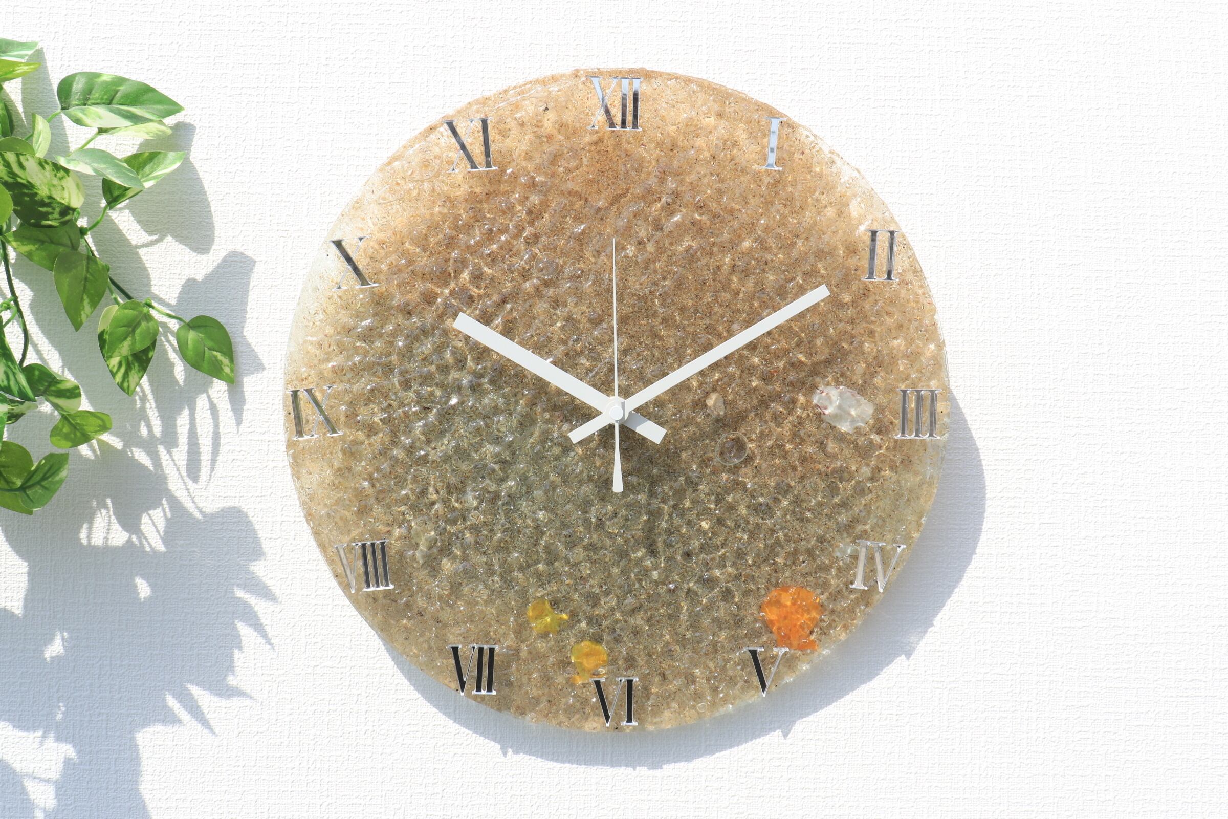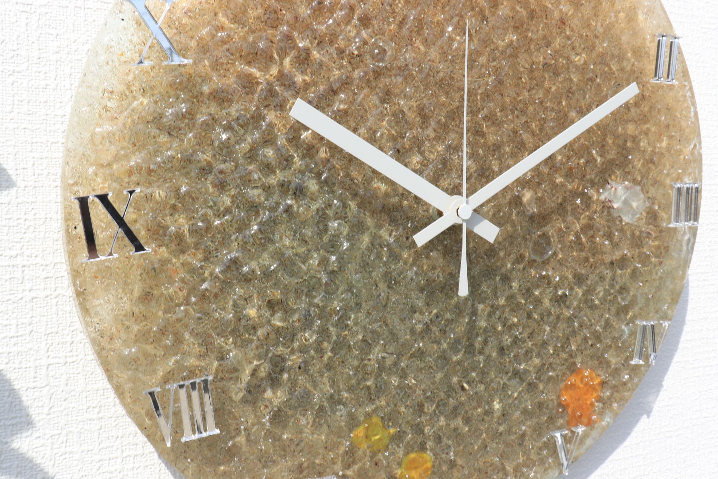 スタイリッシュな数字が並び光沢のある質感の文字盤をよく見ると、貝殻や海の砂が沈んでいる。
